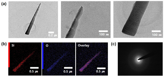 To further investigate the structural properties of the a-Si nanotip, TEM measurement was performed, as shown in Figure 2. To prepare the sample for TEM analysis, the a-Si nanotips were selectively scraped onto the TEM grid and were immobilized by dispersion in acetone. The TEM images showed that no metal catalyst was present at the ends of the a-Si nanotip, as shown in Figure 2a. The a-Si nanotip was also found to have top and middle diameters of 32 and 76 nm, respectively, and a length of ~1.5 μm, which were in excellent agreement with the SEM observation. The corresponding EDX elementary mapping images also revealed that the a-Si nanotip was mainly composed of Si and O atoms (Figure 2b). The selected area electron diffraction (SAED) pattern of a-Si nanotips showed a typical diffusive ring pattern (Figure 2c), which means that the Si nanotip was amorphous. According to the TEM analysis, it was confirmed that the Si nanotips had an amorphous structure and the main constituent elements were Si and O.