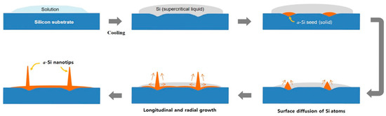 Based on these findings, the so-called liquid–solid mechanism was proposed as the growth process of a-Si nanotips, as shown in Figure 4. For example, the aqueous solution dropped on the Si substrate provided OH− groups that could dissolve the Si substrate. Thereby, the Si substrate surface was roughened and the supersaturated droplets with dissolved Si entirely covered the Si substrate. With aging, solidification can occur at the roughened Si surface (acting as nucleation sites), resulting in the generation of a-Si seeds. Especially, KI used as an Au etchant sufficiently increases the surface energy and reactivity of Au as a metal catalyst for the formation of a-Si seeds even at very low temperatures [19]. In a supercritical fluid environment, the nanotip can be grown via surface diffusion of Si atoms along the side wall of the a-Si seeds. This is known as “Berg’s effect”, in which surface diffusion of Si atoms is driven by the concentration gradient of the Si atoms along the side wall of the nanotips from the bottom to the top [20]. This mechanism indicates why the a-Si nanotip had a sharp tip-like structure. A similar growth phenomenon was previously reported for the tapered ZnO nanostructure (made from liquid Zn) by Yuan et al. [21], where the growth temperature was high (over 400 °C). This behavior at low temperatures is observed in natural snow ices, in which high condensation towards the top surface leads to the formation of needle-like ice crystals [22,23].
