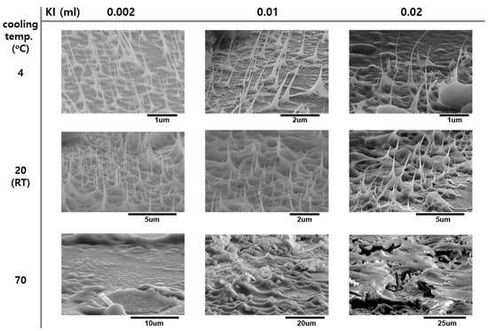 SEM images of a-Si nanotips formed on a Si substrate as functions of KI concentration and cooling temperatures.
