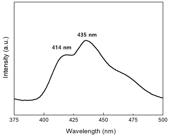 Figure 6 shows the RT PL spectrum from a-Si nanotips obtained under excitation at 265 nm. For this measurement, the a-Si nanotips were solely scraped onto the substrate, on which the PL measurement was performed. A stable and strong PL was observed at around 435 nm (2.85 eV) with a shoulder peak at 414 nm (3 eV). Nishikawa et al. investigated the presence of PL bands ranging from 1.9 to 4.3 eV for high-purity silica glasses and observed PL peaks at around 2.7 and 3.0 eV, which were attributable to the neutral O vacancy and intrinsic diamagnetic defects like two-fold-coordinated Si lone pair centers [24,25]. Therefore, the PL of our sample was also considered to originate from O deficiencies and/or intrinsic defects.