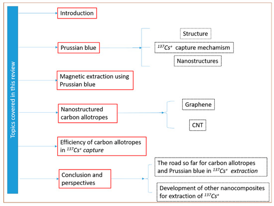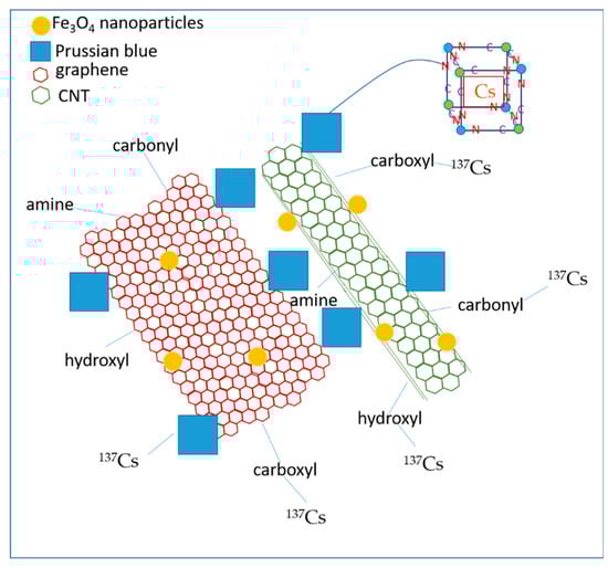 This review will focus on the recent developments in the extraction of 137Cs+ from water as depicted in the schematic outline of Figure 1. It will more specifically survey PB-CNT-Graphene based nanocomposite efficiencies in 137Cs+ extraction. Large-scale applicability in real case scenarios of such nanocomposites will be probed and their nanotoxicity issues will be discussed. A short summary of other new materials is also provided at the end, which opens-up new possibilities in combining these new materials with PB-CNT-graphene based nanocomposites.