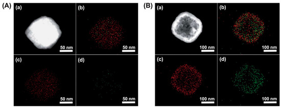 Elemental mapping images of solid (A) and hollow PB (B) nanoparticles of 190 nm in diameter. (a) Dark-field TEM image, (b) elemental mapping of both Fe and Cs (c) elemental mapping of Fe, and (d) elemental mapping of Cs. Adapted with permission from [35], Copyright RSC, 2012.