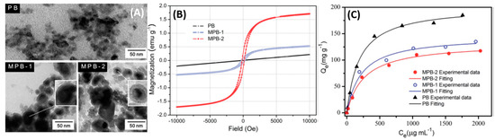 (A) TEM images of PB and magnetic PB (MPB) nanoparticles. (B) Field-dependent magnetization of PB and magnetic PB nanoparticles. (C) Adsorption capacity of samples under different Cs+ concentration. T = 25 °C; contact time = 6 h; [Cs+]initial = 50–2500 μg/mL; madsorbent/Vsolution = 4 μg/mL. Adapted with permission from [44], Copyright RSC, 2016.