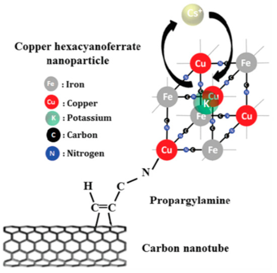 Mechanism of 137Cs+ capture in propargylmine functionalized SWCNT decorated with copper hexanoferrates. Adapted with permission from [74], Copyright RSC, 2017.