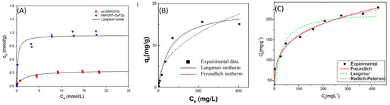 Examples of Langmuir, Freundlich and Redlich-Peterson adsorption isotherms models applied to (A) oxidized MWCNT and CuFC-MWCNT, adapted with permission from [75], Copyright Springer Nature, 2015, (B) Graphene foam-PB composite, adapted from [57] with permission under Creative Commons agreement from Nature Research, 2015 and (C) Chitosan-PB analog-CNT, adapted with permission from [73], Copyright Springer Nature, 2016.