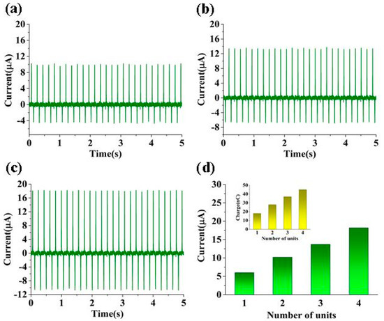 To improve the electrical output, a stacked CN-TENG was developed. The output performance of stacked TENGs with different numbers of working units were measured, and approximate ISC values of 10.2 μA, 13.7 μA, and 18.2 μA, respectively, were obtained (see Figure 4a–c). Additionally, the output current obtained for different numbers of units was compared, as shown in Figure 4d. According to the results, the output current increased with as the number of units increased.