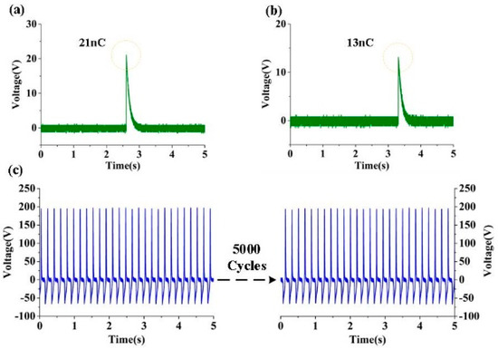 (a) The voltage curve of a 1-nF capacitor connected to the TENGs through a full-wave rectifier bridge, and (b) conductive copper tape, respectively, which serve as the triboelectric pairs. (c) The reliability of the prepared TENG was verified via 5000 cycles of continuous operation.