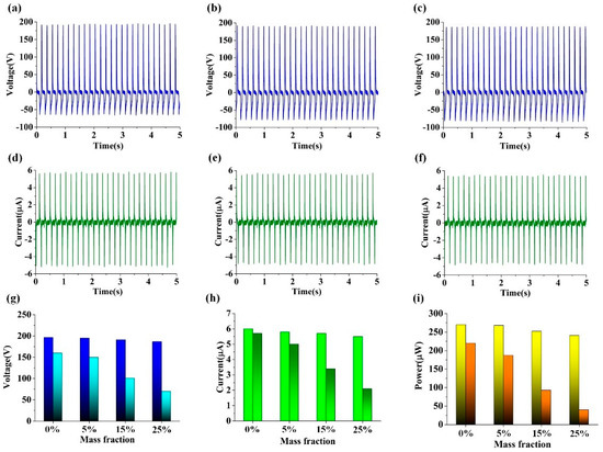 Figure 6 shows the electrical measurement of copper TENGs treated with different concentrations of sodium chloride solution. Approximate VOC values of 150 V, 101 V, and 70 V; ISC values of 5 μA, 3.4 μA, and 2.1 μA, and output power values of 187 μW, 93 μW, and 40 μW were realized at the aforementioned mass fractions (see Figure 6a–f). Corresponding values of 160 V, 5.7 μA, and 220 μW, which were obtained for the untreated TENG, were set as the reference values. Additionally, approximate VOC values, ISC values, and the maximum output power value of TENGs smeared with different mass fractions of the chloride solution were compared, as illustrated in Figure 6g–i. The results display that the output performance decreased with the increasing mass fraction of the solution. This decrease can be attributed to the weak corrosion resistance of the conductive copper.