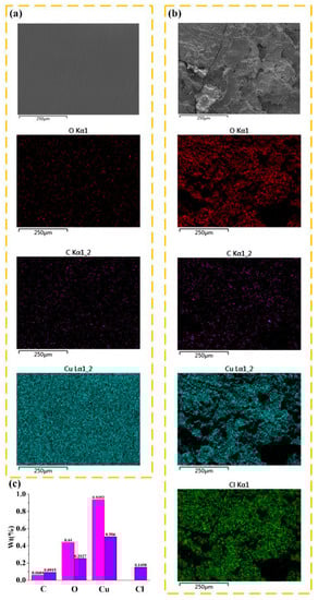 The basic cupric carbonate produced by the reaction not only affects the electrical output of TENG, but also damages human health. However, the copper–nickel alloy has good corrosion resistance in the corresponding environment [42]. In order to visualize the corrosion on the surface of the copper foil, we analyzed the elements on the copper foil surface by sodium chloride solution (shown in Figure 8b), and compared the copper foil surface before treatment (shown in Figure 8a). According to the results, the proportion of copper elements on the surface of the treated copper decreased obviously, which will influence the electrical output of the TENG.