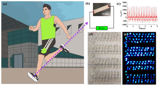 In addition, we demonstrated that the 5 cm × 20 cm CN-TENG can be easily integrated into a shoe, as shown in Figure 9b. When people are exercising, the CN-TENG integrated into shoe can be utilized to harvest mechanical energy, as shown in Figure 9a. The frequency of human motion is about 4 Hz, and the test time is 5 s. As the experimental results show (see Figure 9c), an approximate VOC value of 1500 V is realized for the TENG in the shoe sole. Owing to the walking action, the TENG is capable of driving at least 172 high-power LEDs in series (working voltage: 3.4 V), as shown in Figure 9d,e.
