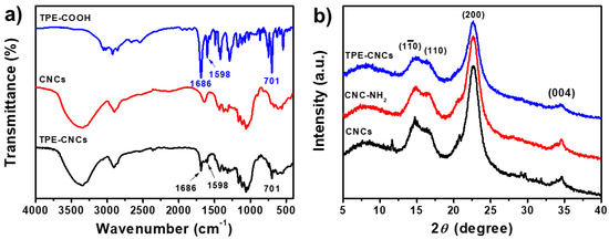 (a) FT-IR spectra of CNCs, TPE-COOH, and TPE-CNCs; (b) XRD patterns of CNCs, CNC-NH2, and TPE-CNCs.