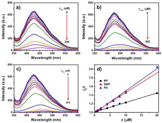 The fluorescence emission spectra of TPE-CNCs aqueous suspensions with the addition of NP, DNP, and PA are shown in Figure 6a–c, respectively. The fluorescence intensities of TPE-CNCs suspensions were gradually quenched with increasing nitrophenolic explosive concentrations. The fluorescence emission was completely quenched after the addition of 200 μM of NP, DNP, or PA. In addition, fluorescence quenching was detected in short response times, and the quenching equilibrium was instantaneously established within several seconds. The Stern–Volmer equation was used to evaluate the quenching efficiency as follows [45]: