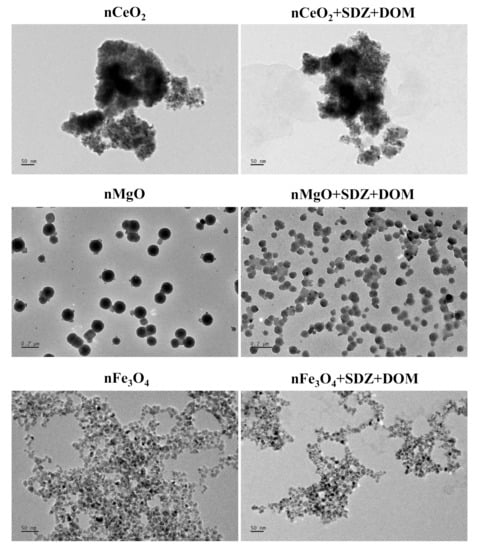 The TEM images show the morphology of the studied particles in the single and combined mixture systems in the algae medium (Figure 1). Analysis of the TEM images indicates that nCeO2 agglomerated intensely and formed irregular shapes. Moreover, nCeO2 showed greater tendency to agglomerate than the other two particles. nMgO in the single and combined systems were spherical particles with dispersion uniformity. Compared with nMgO in the single systems, the particles in the combined systems showed smaller size and increased density. nFe3O4 showed spherical structure and also agglomerated in the test medium. Furthermore, the presence of SDZ and DOM obviously alleviated the extent of agglomeration of nFe3O4. Wang et al. [] also demonstrated that DOM promoted the suspension of nFe3O4 by hydrophobic interactions.