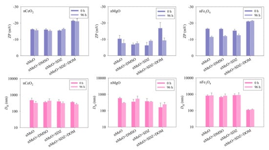 The changes in ZP and DH for nCeO2, nMgO, and nFe3O4 with time in the algae medium were measured and the results are shown in Figure 2. The ZP values of the three nMeO were found to be <0, indicating a negative surface charge upon the particles, which could mean that the nMeO particles were stabilized by a surface layer of anions from the test medium. It can be observed that the nMeO showed no obvious changes in the ZP when the particles were suspended in the presence of DMSO and SDZ. However, the ZP of the nMeO particles in the presence of DOM was more negative than when DOM was absent. Moreover, the ZP values of the DOM alone treatments were found to be −10.2 ± 0.8 (0 h) and −11.1 ± 0.8 (96 h), which were generally more positive than the ZP values of the ternary mixtures. This implies that the DOM effects can be explained by the interaction between DOM and the particles rather than the DOM only. The enhanced surface charges might induce adsorption of DOM onto the surface of the particles [], suggesting that electrostatic repulsion may be the mechanism for dispersion stability. Note that the ZP values of nMgO + SDZ + DOM, nFe3O4, nFe3O4 + DMSO, and nFe3O4 + SDZ systems at 96 h were more positive than their corresponding ZP values at 0 h. This could mean that Mg2+- or Fe3+-ions released and could have neutralized the negative charges at the surface of the particles.