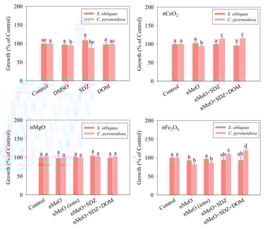 Growth rates of S. obliquus and C. pyrenoidosa exposed to the treatments. The different letters for each species after exposure to the different treatments indicate the significant differences in growth rates, p < 0.05. Data are means ± SD (n = 3).