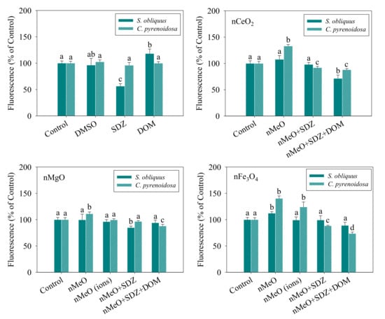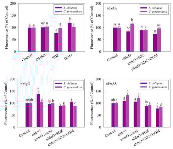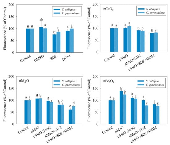 Figure 4 shows the relative levels of the ROS generated in the S. obliquus and C. pyrenoidosa cells exposed to the different treatments. Compared to the control, the DMSO and DOM alone showed no effect in the levels of ROS in the two algal cells, while the SDZ alone resulted in an observable decrease. It was observed that nFe3O4 induced a significant increase in the ROS levels of the two algae, which agrees with the results from Lei et al. [], where iron-based ENP-induced oxidative stress was the main toxic mechanism to algal toxicity. The consistent trend indicated that the mixtures of SDZ and nMeO decreased the ROS levels, irrespective of the particle types. However, the degree of reduction was comparatively reduced with the addition of DOM. The dissolved fractions of nMgO and nFe3O4 showed no effects on the levels of ROS, which means that no toxicity or oxidative stress was induced by the dissolved ions. Leung et al. [] also demonstrated the toxicity of nMgO towards Escherichia coli bacterial cells without ROS production for partial nMgO samples. We found that SDZ displayed a protective effect on the algal cells against oxidative stress induced by the particles. Furthermore, the interaction of the nMeO with co-exposed SDZ and DOM reduced the production of ROS. It is undeniable that there are several known limitations of using the fluorescence probe (DCFH-DA), including failure to detect a specific kind of ROS [,]. Further studies are needed to expand and confirm the definitive ROS using enzyme-based assays.