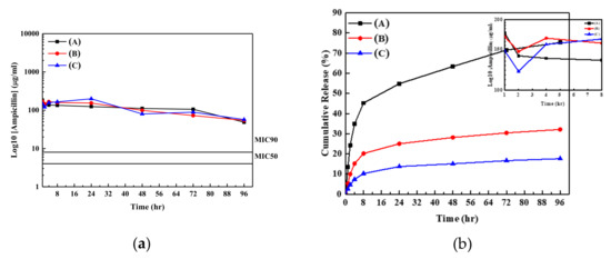 (a) Release profiles and (b) the cumulative amounts of ampicillins released from samples (A–C) into the buffer solution as a function of time.
