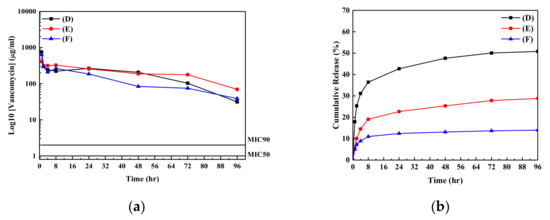 (a) Release profiles and (b) the cumulative amounts of vancomycin released from samples (D–F) into the buffer solution as a function of time.