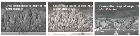 Figure 5 shows the SEM images of sample (F) before and after drug release test. SEM image of pure ZnO nanorod array sample after test was also employed for comparison. SEM image of sample (F) showed that the decomposition of ZnO nanorod arrays took place after the drug release test. Pure ZnO sample without the loading of antibiotic agent showed the similar nanorod morphology, although few decompositions of ZnO nanorod arrays were observed. This could explain why few Zn2+ ions were detected in the buffer solution using ICP-OES analysis. The SEM images shown in Figure 5 confirmed that the decomposition of ZnO nanorod arrays took place during the drug release test. However, the ICP-OES results showed that small amounts of Zn2+ions diffused into the buffer solution. This is possibly due to the low solubility of ZnO material in the nearly neutral solution [18,38]. Decomposition of ZnO sample took place with the H+ ions released from the antibiotic agent and caused the release of Zn2+ions from the ZnO sample into the buffer solution. Kokotov and Hodes [34] reported that the existence of hydroxyl group on substrates is the key factor in the reaction with the metal ions such as Zn2+ ions. Many hydroxyl groups were formed at ZnO sample surface when they were contacted with buffer solution. These Zn2+ions in solution then reacted with the hydroxyl groups on the sample surface to form the uniform ZnO thin films on PEEK substrate, as shown in Figure 5.