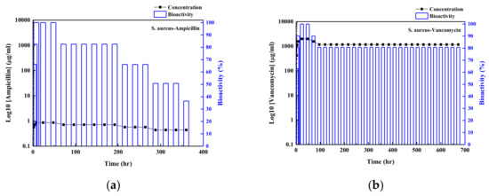 Bioactivities for S. aureus using the release of (a) ampicillin (sample (C)) and (b) vancomycin (sample (F)) from the antibiotic agent/ZnO nanorod arrays samples, respectively.