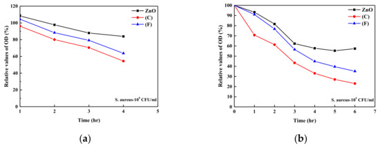 Relative optical density values as a function of time for (a) the initial S. aureus concentration of 108 CFU/mL and (b) 106 CFU/mL with pure ZnO sample; samples (C) and (F) in the solutions.