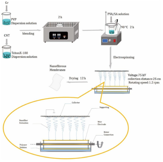 First, graphene (0.05 wt%) and carbon nanotubes (0.02 wt%) were added to deionized water. Afterward, 1 wt% PVP was added to the Gr solution, while 0.5 wt% of tritonX-100 was added to the CNT solution. The solutions were stirred using a mechanical mixer for 2 hours. Next, Gr and CNT solutions were blended at volume ratios of 10:0, 2:8, 4:6, 6:4, 8:2, and 10:0 for 2 hours using a 200 W ultrasound machine (040ST, SHENCHAOJIE, Shenchen, China). Then, 7.5 wt% PVA solution was added to the mixtures, which was mixed at 90 °C for 2 h using a collecting thermostatic heating magnetic stirrer. Second, 2 wt% of SA powders were added to deionized water and mixed at 90 °C for 2 h. Third, different Gr/CNT mixtures were added to the SA solution at a volume ratio of 9:1 for 2 h. Finally, different electrospinning solutions were electrospun into nanofibrous membranes. The collection distance was 25 cm, the spinning voltage was 75 kV, and the rotating speed was 1.2 rpm [23]. The whole process of the preparation of linear electrospinning nanofiber membranes is shown in Figure 1.