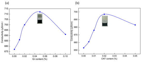 Figure 2 shows the conductivity of Gr and CNT solutions with different concentrations. Regardless of whether it was a Gr or CNT solution, the conductivity increased and then decreased as the concentration increased. The highest conductivity occurred when the Gr solution had a concentration of 0.05 wt% or when the CNT solution had a concentration of 0.02 wt%. The results may be ascribed to the fact that an increase in the nanofillers caused agglomeration, which was detrimental to the effect of dispersion [24].