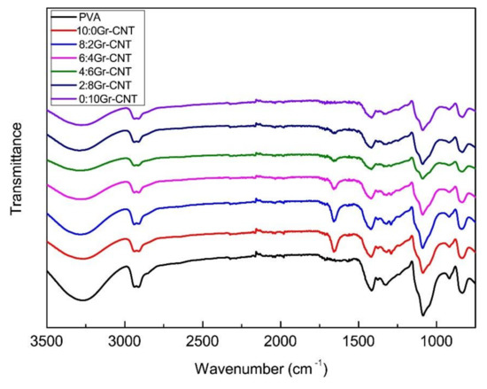 Figure 4 shows that different Gr-CNT ratios form membranes that have a similar spectrum. The characteristic peaks at 2850 cm−1 correspond to the absorption peak caused by the stretching vibration of O–H and C–H from PVA, SA, and the residual water. The absorption peak triggered by C=O of –COOH occurred at 2210.9 cm−1, the characteristic peak caused by the covalent bond between carbon atoms and hydroxyl groups occurred at 2100cm–1, the absorption peak caused by stretching vibration of C=C occurred at 1630 cm−1, the absorption peak caused by the stretching vibration of C–O from C–O–C occurs at 1119.8 cm−1 [29]. Noticeably, the characteristic peaks at 1058 cm−1 were strengthened due to a greater content of Gr, which indicates that Gr was successfully blended in nanofibers and even mixed with CNT. The characteristic peaks of all curves occurred in the same position, which suggests the absence of new functional groups. Therefore, the presence of graphene and CNT and the Gr-CNT ratio did not cause a chemical reaction of mass in the solution.