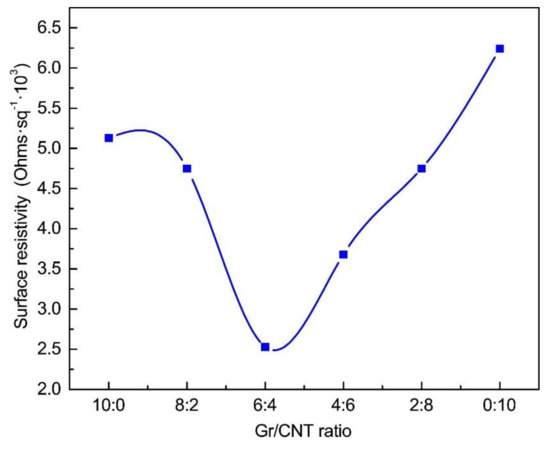 Surface electric resistivity of PVA/SA/Gr/CNT nanofibrous membranes as related to the Gr-CNT ratios. (Control: The surface resistivity of the PVA/SA nanofiber membrane was 7.58 × 109 Ω/m2).