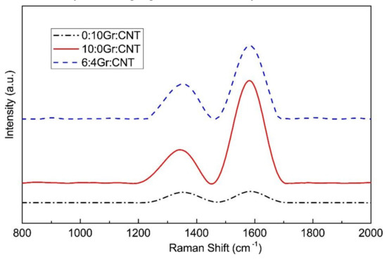 Raman spectrometry of PVA/SA/Gr/CNT nanofibrous membranes as related to Gr-CNT ratios.