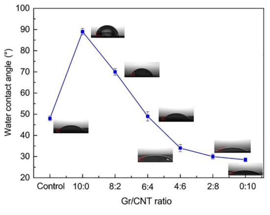 Figure 7 and Table 2 respectively shows the differences and values in water contact angle of PVA/SA/Gr/CNT nanofibrous membranes as related to Gr/CNT. More Gr caused a larger contact angle for nanofibrous membranes. The water contact angle of PVA/SA nanofibrous membranes was smaller, which was 48°. PVA has considerable hydrophilic –OH groups and SA has –COOH groups, which results in a high affinity with water molecules and provides nanofibers with greater moisture absorption capacity [39]. Furthermore, the presence of Gr increases the water contact angle, and there are thus significant differences in the nanofibrous membranes containing different contents of Gr. When the Gr-CNT ratio was 10:0, the water contact angle increased to 89° and the PVA/SA/Gr nanofibrous membranes showed good hydrophobicity. When the CNT ratio gradually increased, the contact angle was gradually decreased. This may be due to the fact that a decrease of the content of Gr, which has a strong hydrophobicity, resulted in an increase of hydrophilicity of the nanofibrous membrane. Moreover, the addition of graphene and carbon nanotubes also gave the nanofibers with a rough surface. According to the Wenzel equation (Equation (1)), the relationship between the wetting angle of a rough interface (i.e., θ*) and a wetting angle (i.e., θ) can be presented as in Equation (1). When γ > 1 and the angle is smaller than 90°, the nanofibers have a rougher surface and a smaller surface contact angle [40,41].