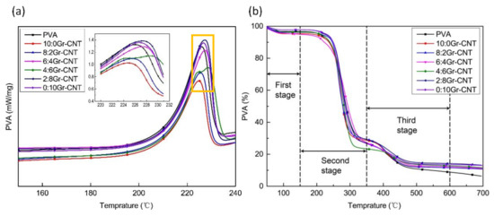 Figure 8a shows that the PVA/SA/Gr/CNT nanofibrous membranes exhibited similar DSC curves with a molten peak within 220–230 °C. The molten peak of PVA nanofibrous membranes occurred at 226.1 °C. Increasing the content of Gr caused the molten peak to shift toward high temperatures. Conversely, when the Gr-CNT ratio was 4:6, the molten peak shifted toward low temperatures. With Gr being dispersed, –COOH and –OH were formed over Gr’s surface. When the content of Gr increased, the –OH of PVA molecular chains and the oxygen functional groups of Gr were combined via hydrogen bonds. The drastic interaction adversely affected the activity of PVA and SA molecular chains [42]. Nevertheless, the excessive content of Gr causes agglomeration and the molten peak was comparatively decreased.