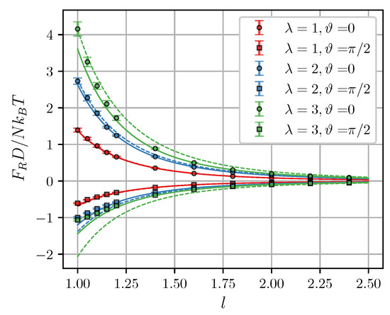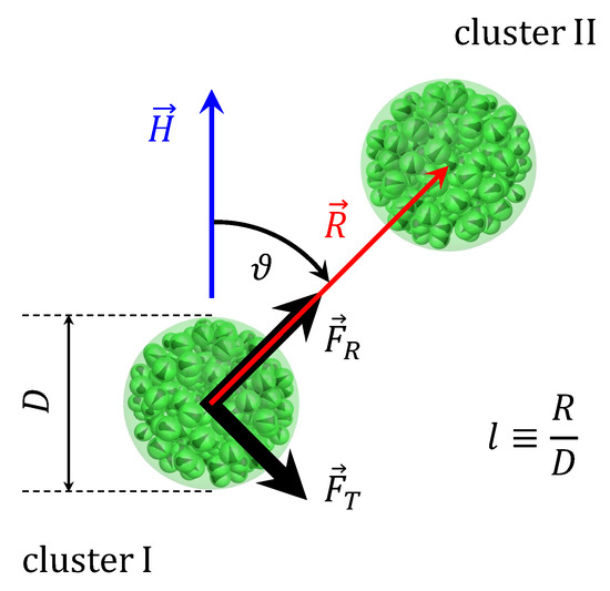 where denotes the sum over cores in the K-th cluster. It is conventional to present the force as a sum of two components, (see Figure 1). The radial component is directed along the center-to-center line, and it is responsible for the repulsion or attraction between clusters. The tangential component is directed perpendicularly to , and creates the torque that tends to align the center-to-center line with the field [36]. Angle brackets in Equation (12) denote the averaging over the simulation time. Note that each randomly generated cluster is unique and has its own distinctive spatial distribution of cores. As a result, at given values of N, , , , , and l, different cluster pairs will always give us slightly different magnetic forces. To eliminate this undesirable uncertainty, it is important to simulate many realizations of the same system with different random clusters, and then to additionally average the force values over these realizations. For every set of input parameters, at least ten independent simulations are performed. Error bars on plots below denote 95% confidence intervals for averages over realizations.
