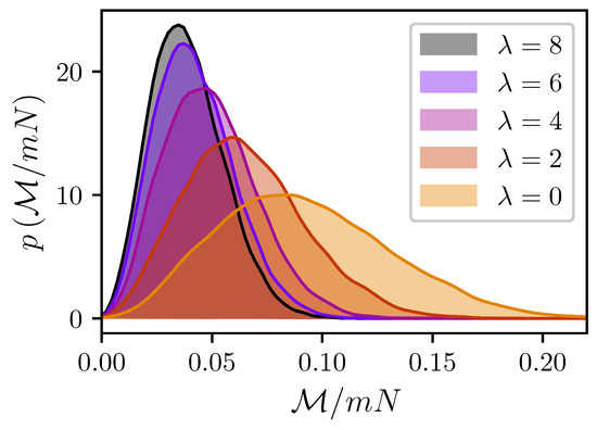 Probability densities for the magnitude of the cluster I magnetic moment. Simulation results for , , , and . Different colors correspond to different (see legend).