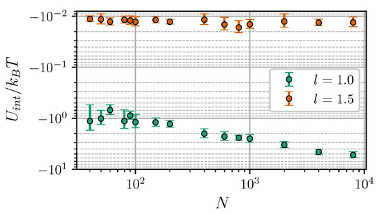 Note that , in the general case, does not coincide with the interaction free energy W. Let us consider a simple system of two isolated, weakly-coupled fluctuating dipoles of constant magnitude. According to [51], the internal energy of this system is connected to the interaction free energy W as . This means that only half of the total energy is available for doing work. The second unavailable half (associated with the entropic contribution to the interaction) is taken up in decreasing the rotational freedom of dipoles and aligning them as they approach each other. To compare the calculated with Equations (19) and (20), we used the fact that within the Lifshitz theory, due to its inherent linear response assumption, the relation also holds true for a pair of dipole-filled spheres [50]. Presumably, the disagreement between theoretical and numerical results at small separations is a finite-sized effect. This is supported by Figure 6, which shows as a function of the core number per cluster N. At the energy is almost insusceptible to the cluster size, while in close contact, its absolute value increases almost by an order of magnitude within the investigated range of .