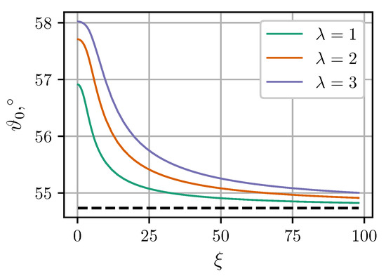 Critical angle at which the central force changes sign as a function of the applied field . Solid curves are MDM predictions for , and different (see legend). The dashed horizontal line is the classical LDM value .