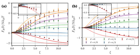 Magnetic central force per core as a function of the applied field at and . (a) and 1.2 (b). Different colors correspond to different angles (see legend in (b)). Symbols are simulation results for , solid curves are from MDM [Equations (23), (29)–(32)], dashed curves are from LDM [Equation (27)]. Insets show an enlarged view of the weak-field part of simulated dependencies. Dotted lines in insets are MDM predictions for shifted upwards along the y-axis to coincide with the simulation data at .
