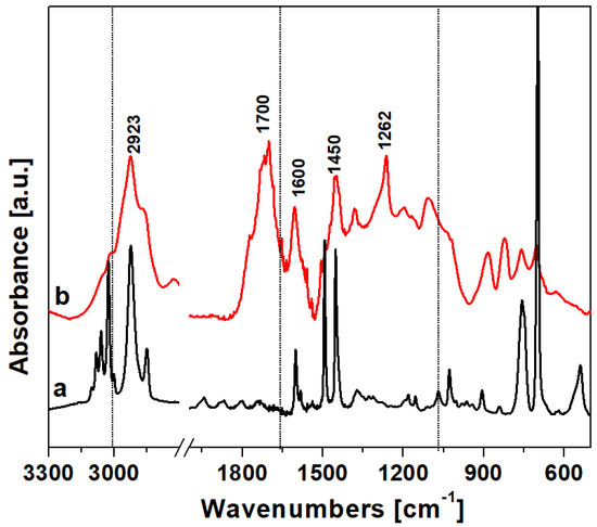 The FTIR spectrum of HCP-PS is reported in Figure 2. In the high-frequency region, both the PS precursor (curve a) and the HCP (curve b) are characterized by bands at 3100–3000 cm−1, attributed to aromatic C–H groups stretching modes. After polymerization, the group of bands in the region 3000–2800 cm−1 due to the stretching of aliphatic C–H became more intense due to methylene linkers between the aromatic rings. The low-frequency region shown in the PS spectrum the structural bands were due to –CH2 and aromatic –CH2 bending bands. The spectrum of HCP shows new bands in the region 1800–1700 cm−1 and 950–650 cm−1 due to the higher number of positions substituted on the aromatic rings after the polymerization. Also, the bands at 1450 cm−1 due to the –CH2 bending mode of the methylene linker, along with the band 1262 cm−1 due to –CH2 wagging modes of the chloro-methylene groups confirm the successful cross-linking reaction.