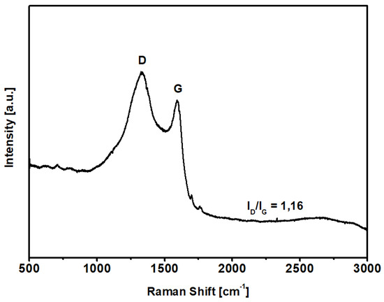 Raman spectroscopy was used to evaluate the carbonization degree after the KOH-activated thermal process described above; the spectrum of KPS-1 is shown in Figure 3. The KPS-1 Raman spectrum shows two main vibrational modes at 1329 and 1593 cm−1. The 1593 cm−1 mode (G peak) corresponds to the Raman-allowed mode in the ideal graphite, and the 1329 cm−1 mode (D peak) corresponds to the disorder-induced band, which is associated to the large density of phonon states [45]. In particular, the strong D-band peak demonstrates that the microporous carbon has a low degree of graphitization ( = 1.16) and contains a significant amount of disordered sections and defects [46].