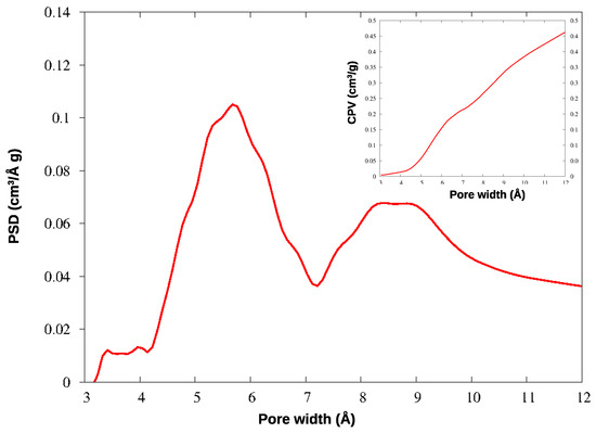 In KPS-1, a rich family of micropores appears below 10 Å. To investigate this region in greater detail, this material was further analyzed by adsorbing CO2 at 273 K: the QSDFT analysis was applied to the CO2 isotherm, providing the PSD and CPV for ultramicropores, reported in Figure 6. The smallest pores have been described in much greater detail by CO2 adsorption at the higher temperature, as is well-known: the ultramicropores around 4–7 Å width are clearly characterized by this experiment. Notably, both gases find a family of micropores at 9 Å, though their relative abundance is different in the N2 and CO2 curves; however, the two gases provide very similar values for the total microporous volume (CPV).