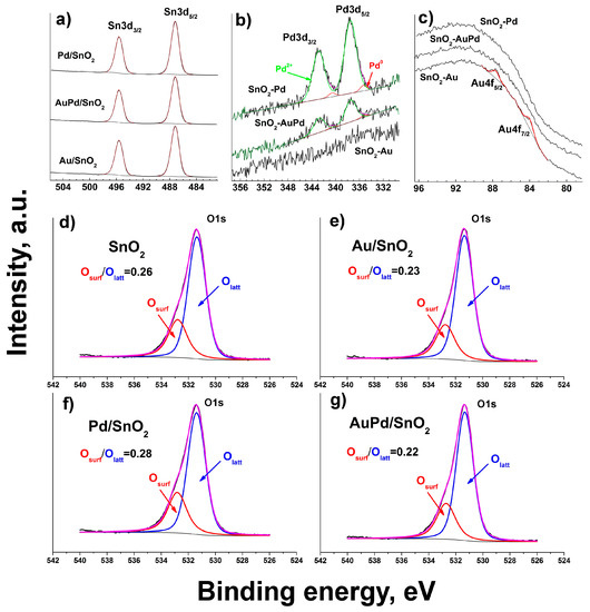 The energy of Pd3d5/2 peak (337.4–337.5) (Figure 1b), observed for Pd/SnO2 and AuPd/SnO2 samples, corresponds to Pd2+ cations, but however is higher than the one known for PdO (336.7 eV) [26]. Deconvolution of Pd3d XP spectra allows the assumption of a small fraction of metallic Pd in the samples, around 4% of total Pd content. However, due to low intensity of Pd3d peaks it is hard to make a firm statement on that matter. Gold 4f lines are observed only in the Au/SnO2 sample (Figure 1c), while in the AuPd/SnO2 they are not present, probably due to the low Au content. The sensitivity of the XPS technique towards Au is additionally lowered in the given samples due to overlapping of Au4f lines by more intense and broad Sn4p line. The observed energy of Au4f7/2 peak (84.0 eV) corresponds to metallic gold [27]. O1s XP lines for synthesized materials (Figure 1d–g) reveal special features, originating due to metal modification of SnO2 surface. The observed lines can be described by two components, one of which (531.4 eV) is common for all obtained materials and corresponds to SnO2 lattice O2− ions. Only in the case of bimetallic modified sample AuPd/SnO2 is it slightly shifted to 531.3 eV, indicating a kind of stronger electronic interaction between the noble metal and metal oxide components, than in case of monometallic modified samples. The other component (532.8 eV) is usually attributed to various surface oxygen species, originating from ambient oxygen chemisorption and dissociation [28]. This component again is shifted (532.7 eV) in case of bimetallic loaded sample, which corresponds to modified chemical environment for surface-related oxygen species. Moreover, the O1s XPS spectra component peak areas indicate that the atomic ratio of surface to lattice oxygen significantly increases upon Pd-metal modification of SnO2. This can be attributed to reported previously facilitated formation of surface hydroxyl groups upon functionalization of SnO2 with Pd [14]. Most probably it occurs due to partial oxidation of metallic Pd on the SnO2 grain surface. In the case of Au/SnO2 and AuPd/SnO2 this ratio is lower than in case of pure SnO2. This may occur due to the reported enhancement of oxygen dissociative adsorption due to catalytic spillover effect of gold particles, distributed over tin dioxide grains [29]. Such new sites of O2 molecule adsorption may affect the distribution of surface negative charge, concentrating ionized oxygen species in the local area in proximity around gold particles. Thus, more distant from gold particles oxygen chemisorption sites become inactive. Additionally, the active surface oxygen forms in the case of Au-modified SnO2 will be discussed below during TPR-H2 spectra analysis.