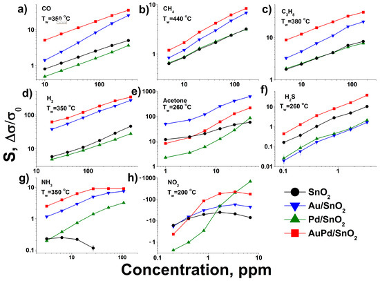 Dependence of gas sensor response of synthesized materials on gas concentration at maximum response working temperature for AuPd/SnO2 material: (a) CO (b) CH4 (c) C3H8 (d) H2 (e) acetone (f) H2S (g) NH3 (h) NO2 in dry air.