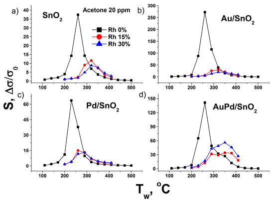 The negative effect of humidity is observed in the whole range of working temperatures for all tested gases and leads to gradual decrease of sensor response as air water content grows. The only two observed exceptions are acetone and NO2. In the case of acetone (Figure 8) the drop of sensor response after humidity increase from 0 to 15% Rh changes to moderate response growth in case of AuPd/SnO2 material after relative humidity increase from 15 to 30%.