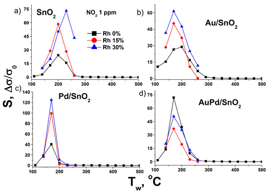 Maximum sensor response towards oxidizing gas—NO2—is also observed in the case of bimetal modified SnO2. However, Pd modified tin dioxide demonstrates very similar behavior with profound response towards NO2 at low operating temperatures. High sensitivity of semiconductor metal oxides towards NO2 upon Pd modification has been reported for systems with various chemical composition and morphology [59,60,61,62]. In case of Pd-clusters formation on SnO2 surface their ability to easily switch from reduced to oxidized state plays major role in gas sensor performance. In the case of oxidizing gas NO2 complete oxidation of Pd clusters to PdO state generates electron depleted regions in the SnO2 near surface layer around in accordance with Fermi level control mechanism, leading to the profound rise of electrical resistance [63,64]. In this sense conditions of dry air at elevated temperatures may be considered as reducing, compared to the presence of 1 ppm of NO2. Hence, some fraction of PdO clusters in such conditions return at partially oxidized or even reduced states. It may be speculated, that in the case of bimetallic modified SnO2 activation of surface oxygen species through spillover effect by metallic Au leads to more complete oxidation of PdO clusters, resulting in the observed higher baseline resistance of the material. The close proximity of Pd and Au components on the SnO2 surface facilitate this sensibilization mechanism. It should be noted, that Au/SnO2 material also demonstrates improved sensitivity towards NO2, compared to pure SnO2. Such behavior has also been observed in previous studies with wet-procedure obtained Au/SnO2 nanocomposites [34,65,66]. It indicates, that the high electron affinity of NO2 gas molecule may result in its enhanced chemisorption on the gold-modified SnO2 surface via the same spillover mechanism, which was reported for oxygen molecule [29]. This phenomenon should facilitate complete oxidation of Pd by chemisorbed NO2 molecules in case of bimetallic modified AuPd/SnO2 nanocomposite, leading to the observed excellent response of this material towards NO2.