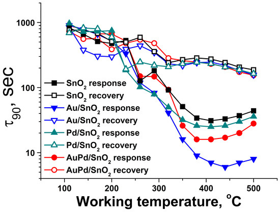 Au-containing materials, particularly, the monometallic modified Au/SnO2 sample, demonstrate significantly lower times for 90% response during gas sensor operation, compared to pure SnO2 (Figure 10). This phenomenon may be related not only to abundance of active sites of gas molecule oxidation on the surface of the material, but also to their higher turnover frequency. However, this matter requires a separate study. The slower response in the case of AuPd/SnO2 compared to monometallic Au/SnO2 material may be connected to the processes of surface Pd component reduction from PdO to Pd0 state, passing at lower rate compared to adsorbed gas molecules oxidation.