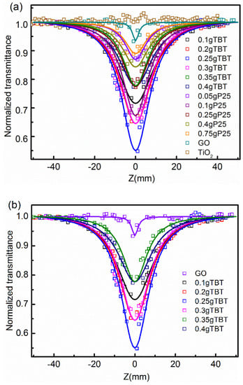 Figure 7 displays the open aperture Z-scan results of the as-prepared materials at 300 μJ. It was apparent that almost all samples showed only a valley at the focus, while TiO2 showed slight nonlinearity. As previously mentioned, a decrease of normalized transmittance indicated the NLO performances. The 0.25 g TBT sample showed the best nonlinear optical performances, from Figure 7a, which performed better than the single-walled carbon nanotubes reported in reference [56]. For TBT series, the 0.25 g TBT sample showed the best nonlinear optical performance, while the 0.1 g P25 sample performed best in the P25 series. As for the variation tendency of the respective series, the optical limiting performances increased first and then decreased with the increase of the addition of Ti precursors. Here, results of the TEM were easily combined. When the amount of Ti precursors was less than the optimal addition, rGO sheets were capable of accepting more photo-induced electrons and were not “saturated”. While the amount of Ti precursors exceeded the optimal addition, the interaction between TiO2 particles was greater than that of TiO2 particles and rGO, resulting in restrictions on the charge transfer process. Also, the gap between the OL performances of 0.25 g TBT and 0.1 g P25 was observed. As a matter of fact, the gap between two samples, to a great extent, contributed to the differences in the microstructures of the two series samples. Raman spectra indicated that TBT series samples had a better degree of order that was conducive to charge transfer. TEM displayed that TBT samples had smaller particle sizes and larger specific surface areas. The specific surface area was an important parameter in the performance measurement for the nanoparticles. To a certain extent, the quantum size effect in TBT samples played a synergistic role in OL performances.