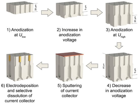 - Potentiostatic anodization at the high voltage was carried out until the entire porous film thickness reached 45 μm (step 3 in Figure 1).