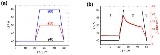 - The voltage was increased from 40 V to the high value (Uhigh = 50 V for the template denoted as s50 and Uhigh = 60 V in the case of the template s60) linearly with a charge passed during anodization (step 2 in Figure 1). If the templates were formed at a constant voltage of 40 V, they were denoted as s40 (Figure 2a). To produce transitional layers with the same thickness of 5 µm for the samples with a various value of the high voltage, the rate of voltage increase of 0.96 and 1.92 V·cm2·C−1 was used for the preparation of templates s50 and s60, respectively.