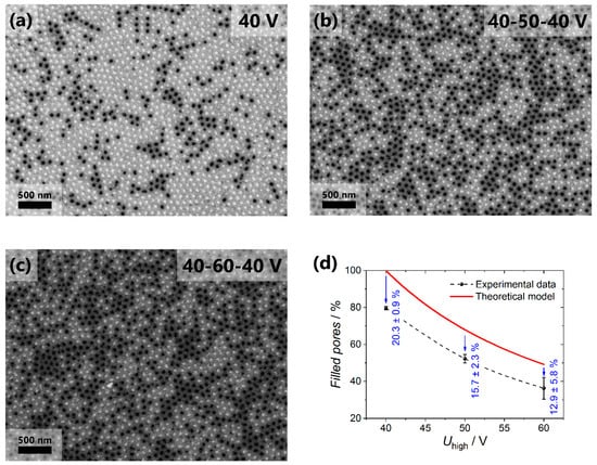 Figure 3a–c shows SEM images of the surface of the nanocomposites after the selective removal of the copper current collector in the acidified solution of hydrogen peroxide. The light-colored pores on the images correspond to the channels filled with gold, and the black-colored pores are empty. The diameter of nanorods is 52 ± 5 nm for all the samples. With the increase in Uhigh, the fraction of the filled channels decreases, which is caused by the blocking of a certain portion of pores (Figure 3d). The fraction of the pores accessible to the electrodeposition was calculated using the interpore distance by the formula: