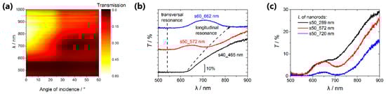 Angular-wavelength transmission spectrum of the sample s50_289 nm (a); transmission spectra of the samples with different volume fraction of metal (b) and with different nanorods lengths in the same template s50 (c). In all cases the incidence angle of 25° was used.